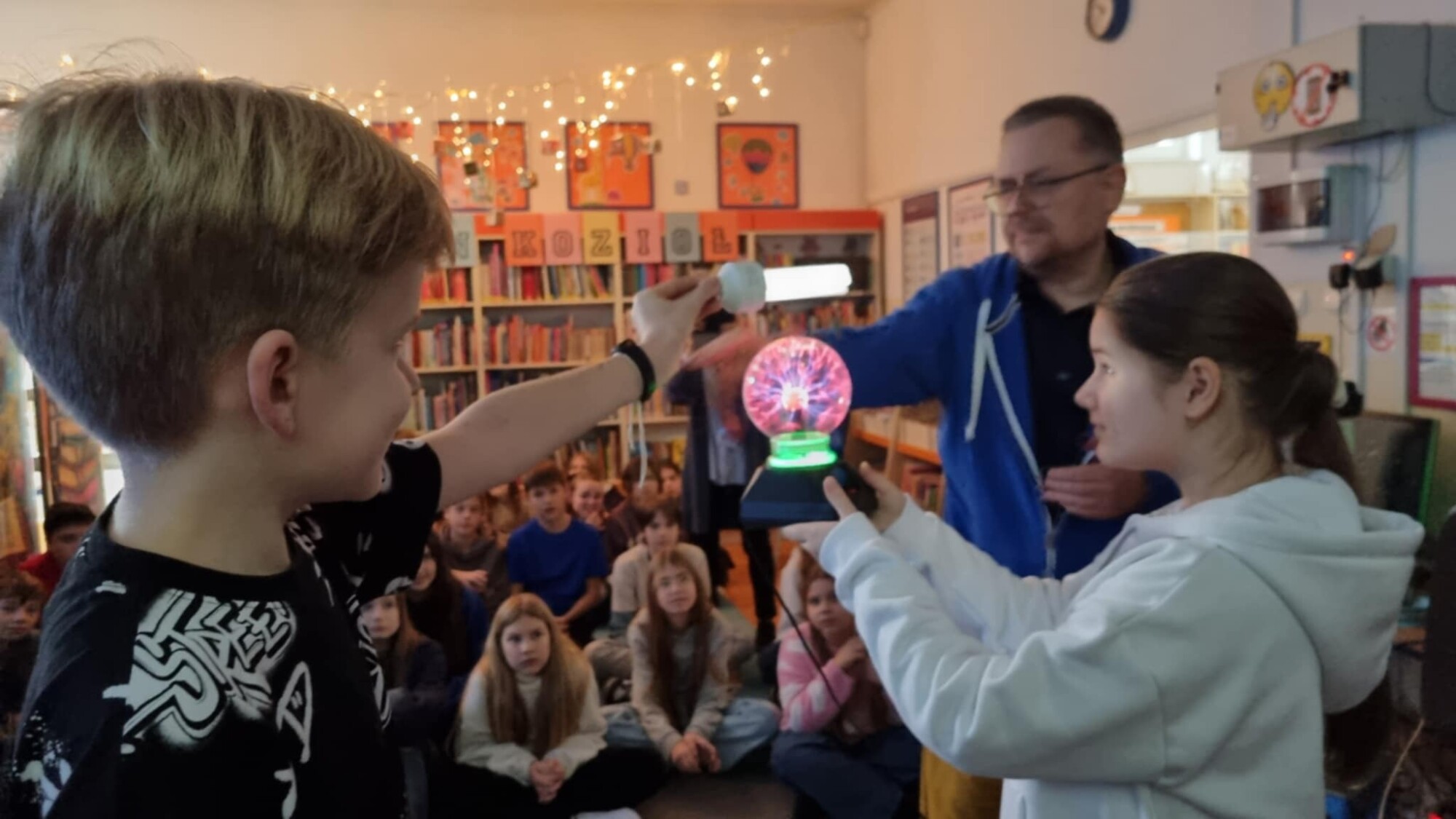 Na koniec spotkania poczuliśmy na własnej skórze czym jest przewodnictwo prądu i bez trudu mogliśmy sobie wyobrazić jak wyglądała praca Nikoli Tesli – tytułowego Władcy Piorunów – nad wynalazkami związanymi z elektrycznością. Niezwykły pokaz bezprzewodowego przepływu energii elektrycznej z udziałem trójki uczniów i strzelającej piorunami kuli plazmowej (szklana kula wypełniona mieszanką gazów szlachetnych, w której wiją się wstęgi wyładowań elektrycznych) zrobił olbrzymie wrażenie na publiczności- ten wynalazek Nikoli Tesli jest niezwykle widowiskowy i pozwala na bezpieczne przeprowadzanie doświadczeń. W ten sposób uczniowie, chociaż na chwilę mogli zostać "władcami piorunów" ! Eksperyment ten nawiązywał do genialnych projektów i doświadczeń Nikoli Tesli, bohatera „Skrzyni władcy piorunów”. To była ciekawa lekcja, prawdziwa gratka dla młodych czytelników – miłośników powieści młodzieżowych z nutą dreszczyku. Po spotkaniu ustawiła się kolejka po autograf pisarza.