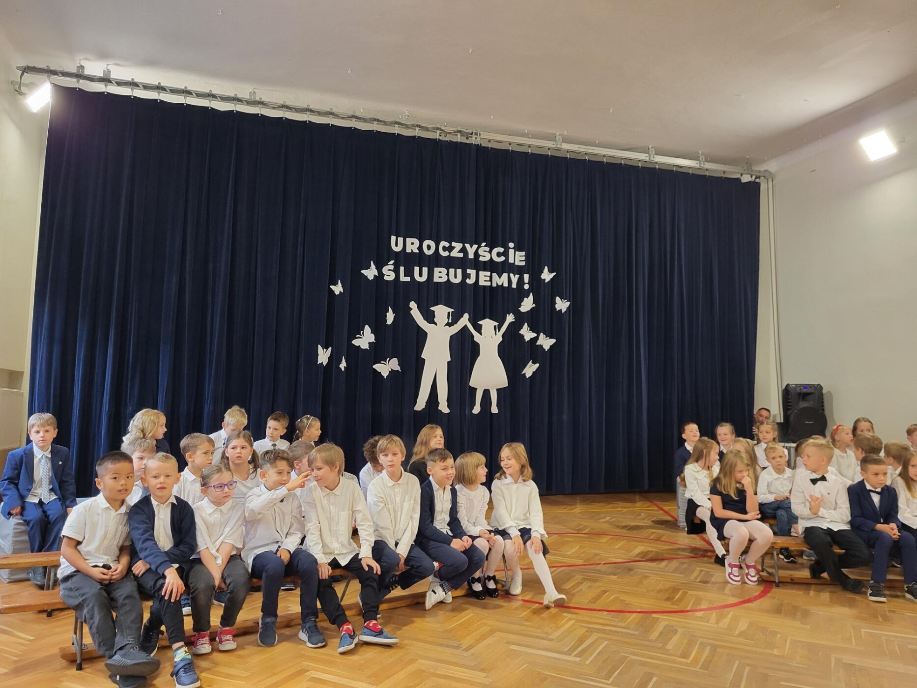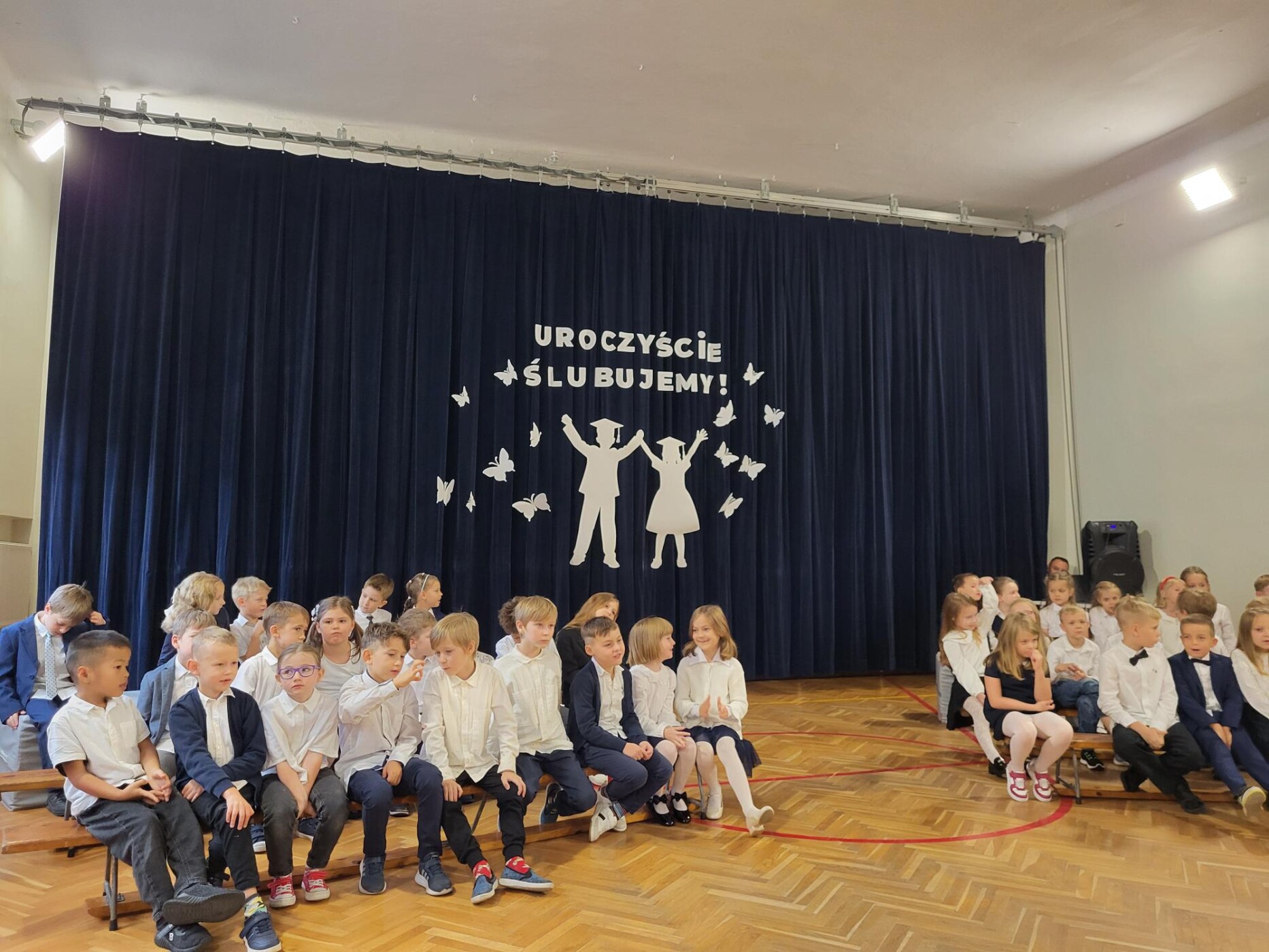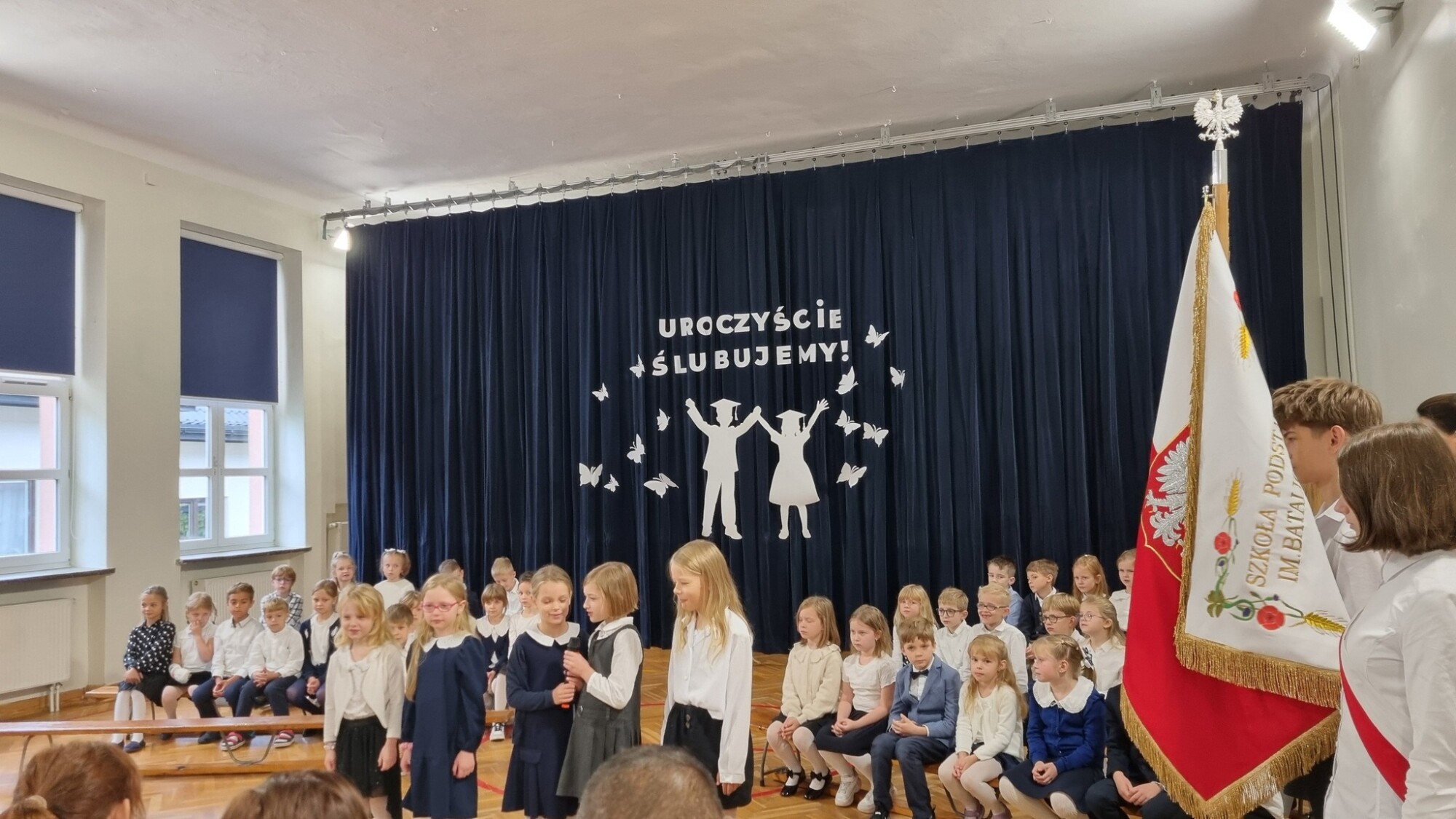 Do naszej szkolnej społeczności 10 października dołączyli nowi uczniowie. Spotkanie rozpoczęło się od odśpiewania hymnu państwowego i hymnu szkoły, w asyście pocztu sztandarowego. Ślubowanie 77 dzieci z klas pierwszych oraz program artystyczny z rozrzewnieniem obserwowali rodzice, rodzeństwo oraz przedstawiciele Rady Rodziców, która tradycyjnie ufundowała pierwszakom szkolne tarcze. Mimo stresu związanego z pierwszym publicznym występem nad którym czuwały panie wychowawczynie : Sandra Doszko, Magdalena Jarosz, Agnieszka Dejniak, Joanna Górczyńska - dzieci doskonale sobie poradziły i udowodniły, że są gotowe, aby stać się stuprocentowymi uczniami. Pani Dyrektor Hanna Ratańska-Szot dokonała pasowania, dotykając ramienia każdego ucznia dużym ołówkiem i wypowiadając słowa: “Pasuję Cię na ucznia klasy pierwszej”. Twarze pierwszaków zdradzały ogromne przejęcie, jednak najbardziej wzruszeni byli rodzice swoich pociech.