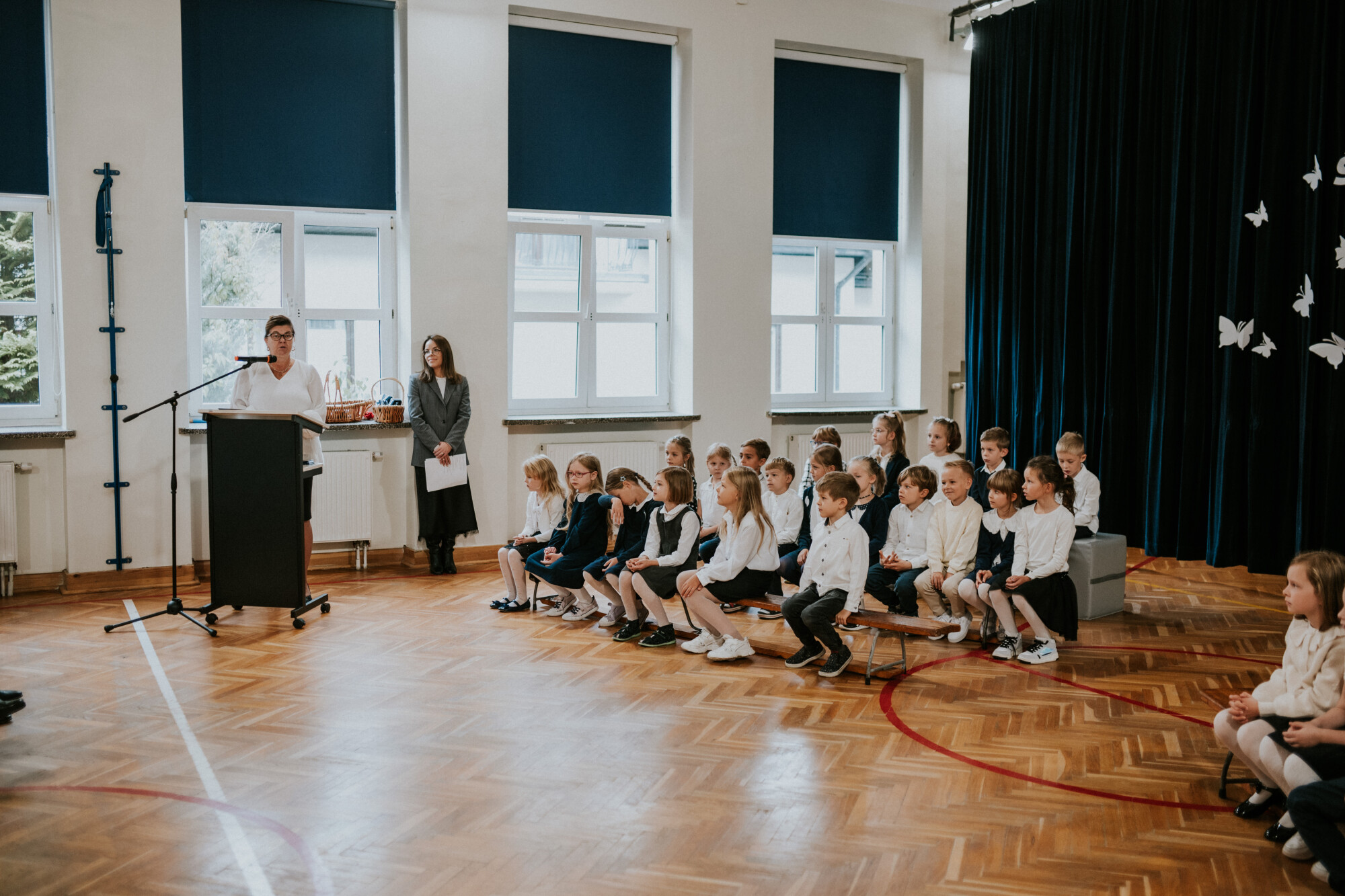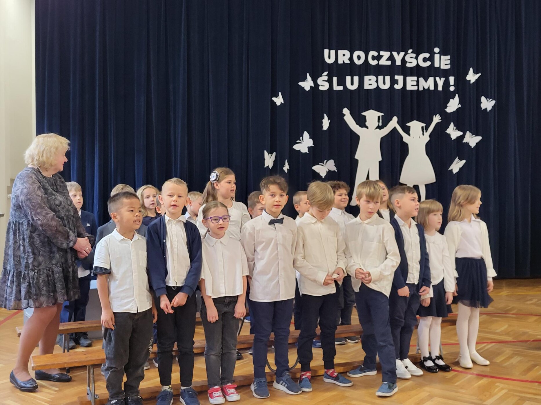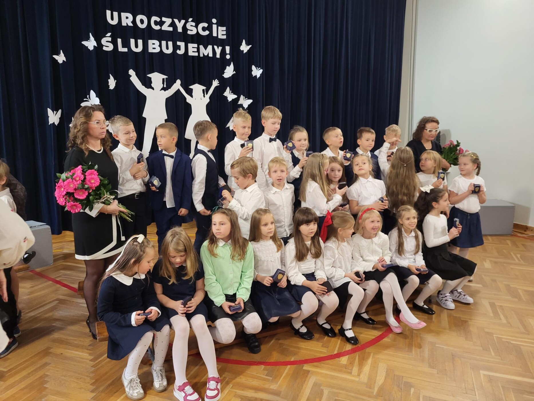 Do naszej szkolnej społeczności 10 października dołączyli nowi uczniowie. Spotkanie rozpoczęło się od odśpiewania hymnu państwowego i hymnu szkoły, w asyście pocztu sztandarowego. Ślubowanie 77 dzieci z klas pierwszych oraz program artystyczny z rozrzewnieniem obserwowali rodzice, rodzeństwo oraz przedstawiciele Rady Rodziców, która tradycyjnie ufundowała pierwszakom szkolne tarcze. Mimo stresu związanego z pierwszym publicznym występem nad którym czuwały panie wychowawczynie : Sandra Doszko, Magdalena Jarosz, Agnieszka Dejniak, Joanna Górczyńska - dzieci doskonale sobie poradziły i udowodniły, że są gotowe, aby stać się stuprocentowymi uczniami. Pani Dyrektor Hanna Ratańska-Szot dokonała pasowania, dotykając ramienia każdego ucznia dużym ołówkiem i wypowiadając słowa: “Pasuję Cię na ucznia klasy pierwszej”. Twarze pierwszaków zdradzały ogromne przejęcie, jednak najbardziej wzruszeni byli rodzice swoich pociech.
