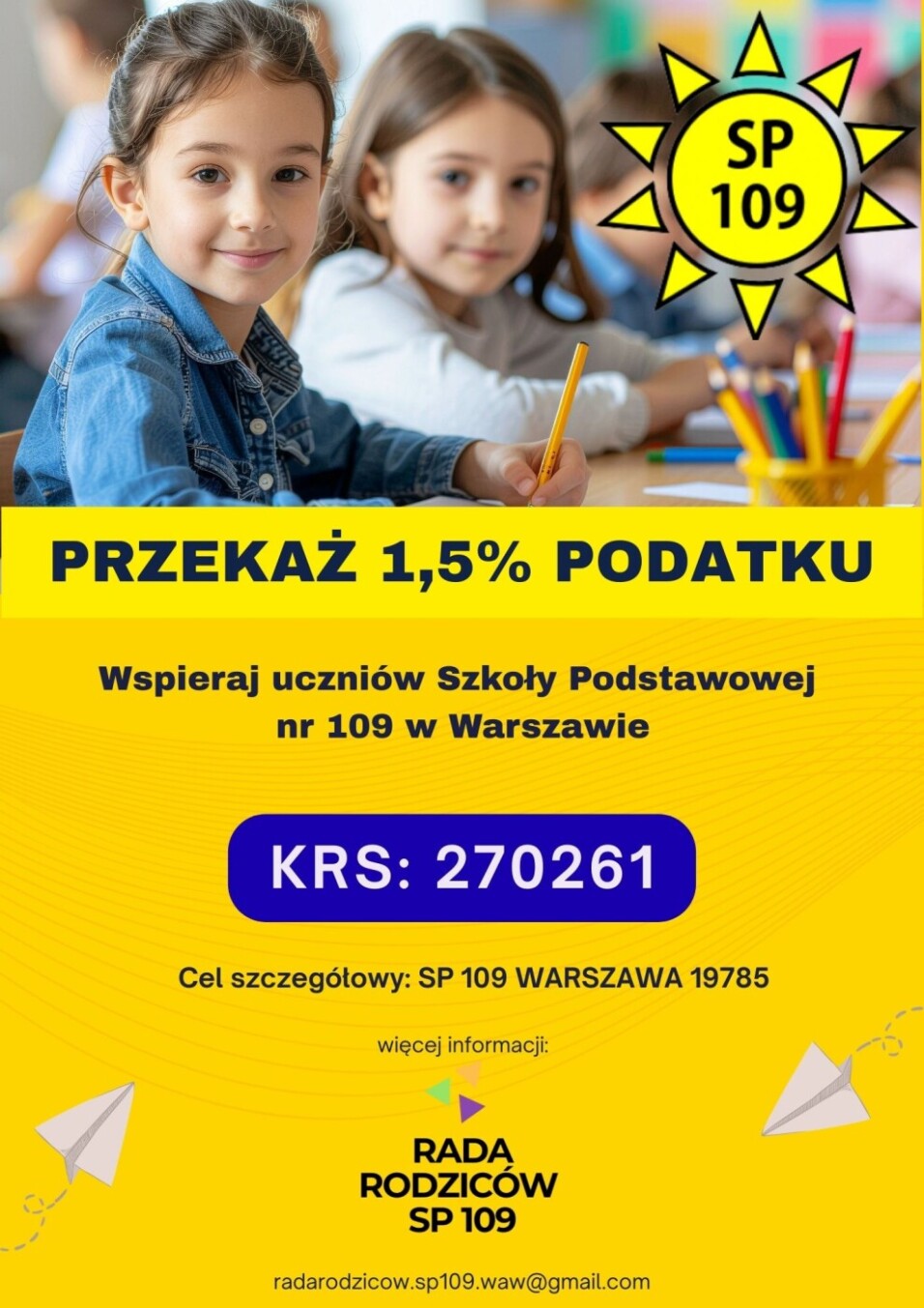 zachęcamy do przekazania 1,5% swojego podatku na wsparcie uczniów Szkoły Podstawowej nr 109 w Warszawie.